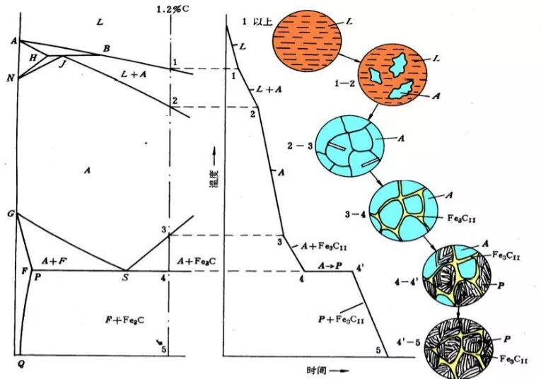 在T1~ T2開始由液相結晶出奧氏體,到T2結晶完畢。到T3溫度時由奧氏體結晶出二次滲碳體,當到達共析溫度時剩余的奧氏體發生共析反應生成珠光體,低于共析溫度由鐵素體析出三滲碳體忽略!